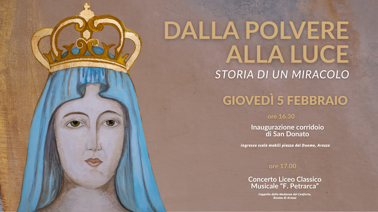 Il taglio del nastro si terrà davanti all’ingresso del corridoio in piazza del Duomo, alla presenza del Vescovo della Diocesi di Arezzo-Cortona-Sansepolcro Mons. Andrea Migliavacca, del parroco della Cattedrale di Arezzo Don Alvaro Bardelli, del vicesindaco di Arezzo Lucia Tanti, dell’ideatrice dell’opera Laura Ghezzi, della coordinatrice dei lavori per l’Associazione Culturale La Staffetta Ets Laura Folli, della calligrafa senese Adele Boriosi, dell’architetto e Tecnico del progetto Roberto Felici, del direttore della Fondazione Arezzo Intour Rodolfo Ademollo e del direttore aggiunto di Confcommercio Firenze-Arezzo Catiuscia Fei. A seguire, alle ore 17.00 nella Cappella della Madonna del Conforto gli studenti del Liceo Classico Musicale “F. Petrarca” offriranno un concerto che suggellerà simbolicamente la conclusione del progetto.